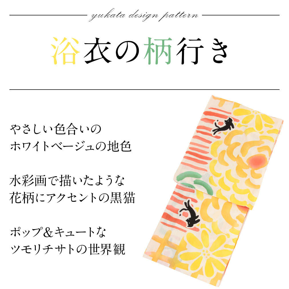 商品情報 色・柄 ベージュ / 花と猫 素材・織り 綿100% / 変わり織 サイズ 着物丈:約165cm 袖丈:約49cm 裄丈:約68cm ブランド tsumori chisato 製造 日本製 ※こちらの商品は浴衣単品での販売です。