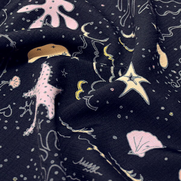 【商品内容】浴衣1点【色柄】暗い紺地にピンク・薄いパープル・クリームイエローなどのヒトデや貝。