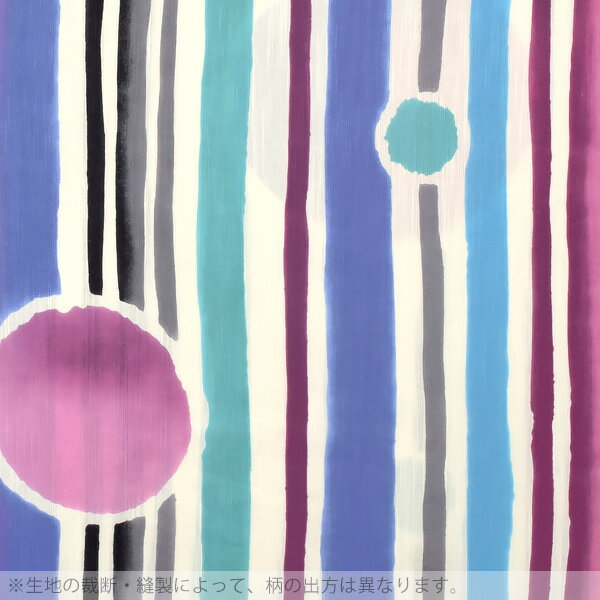 【商品内容】お仕立て上がり浴衣1点【カラー】生成り地パープル系の色合い、グリーン、黒グレーの縞、大小の水玉模様。