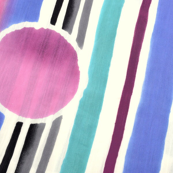 生成り地パープル系の色合い、グリーン、黒グレーの縞、大小の水玉模様。